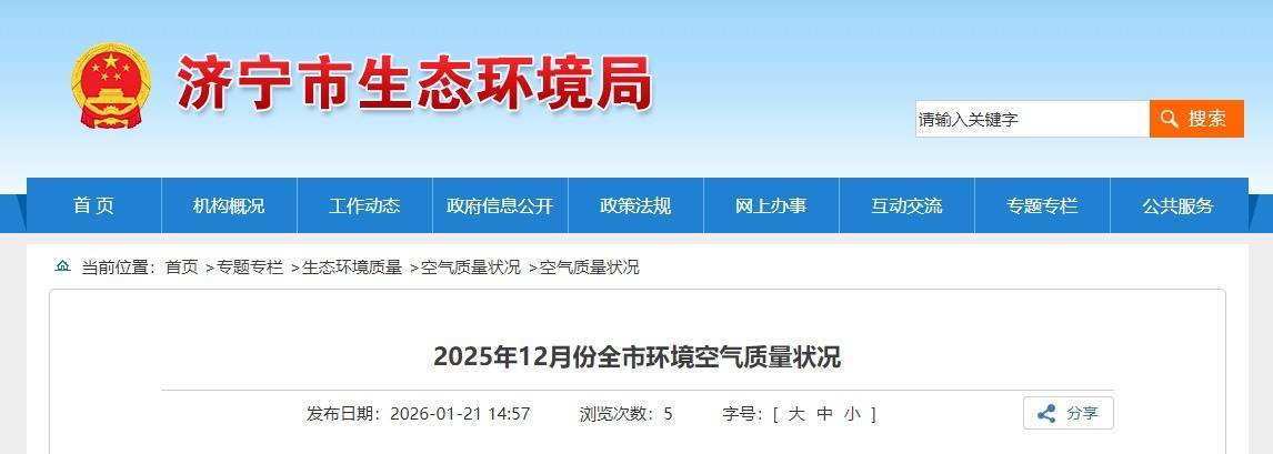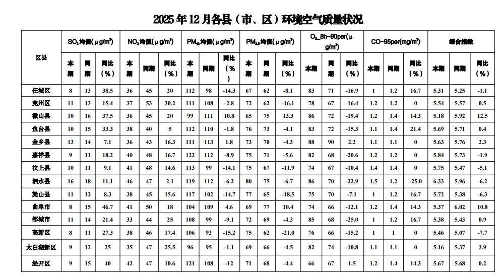 1月21日,济宁市生态环境局发布2025年12月份济宁市环境空气质量状况,12月全市环境空气质量综合指数为5.21,同比改善2.3%;优良天数比例为61.3%,同比减少12.9%;PM2.5浓度为67μg/m3,同比恶化6.3%;PM10浓度为105μg/m3,同比恶化6.1%。