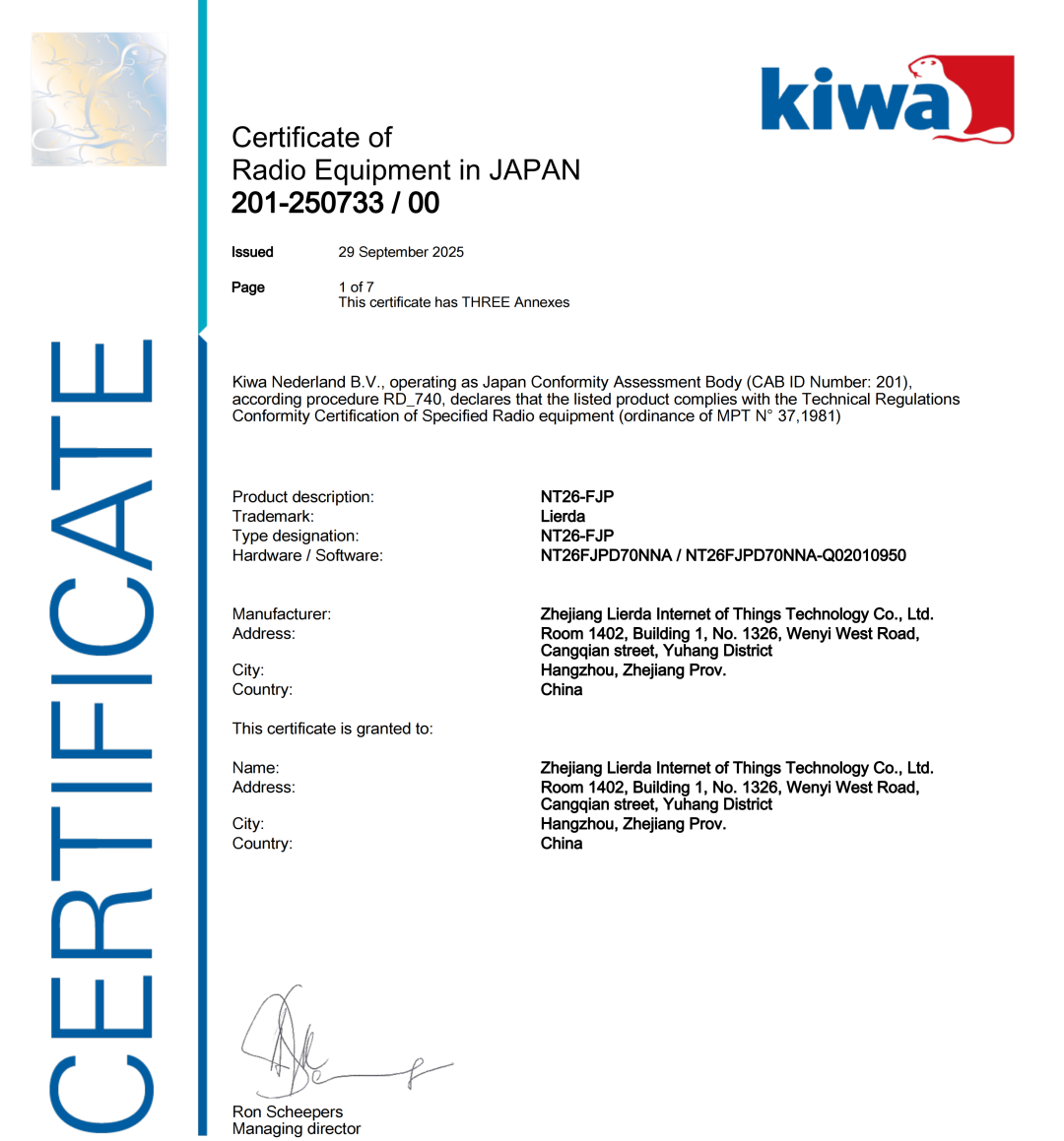 近日,利尔达科技集团专为日本市场量身打造的Cat.1无线通信模组NT26-FJP,成功取得了日本TELEC(电信设备技术符合性认证)与JATE(电信终端设备认证机构)双重认证。